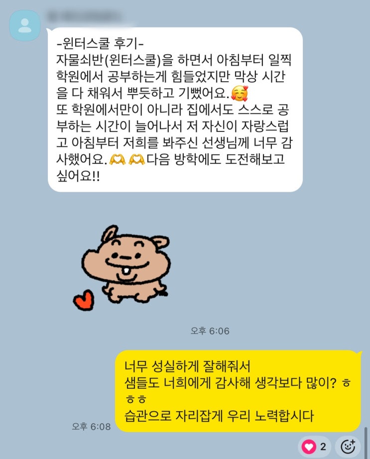 청운학원에서는 이번 겨울방학 동안 윈터스쿨을 진행하였는데요, 학생들의 후기입니다! 윈터스쿨은 단순한 방학 특강이 아니라, 학생들 스스로와 약속한 시간을 지켜 낸 성장의 기록이었습니다. 끝까지 최선을 다해 준 우리 학생들!! 정말 고생많았습니다. <img src="https://blogthumb.pstatic.net/MjAyNjAyMTJfMjY1/MDAxNzcwODg3NzcxNTE0.SvKpiqFiqOsanY_8TcX-JSUtuuPOB1s0hmxkGm4VypEg.F9JVYjgQoKoPJpS70i5UaDsPujx0iI9b0AIlRmNKqsgg.JPEG/KakaoTalk_20260212_175204343_01.jpg?type=s3" />