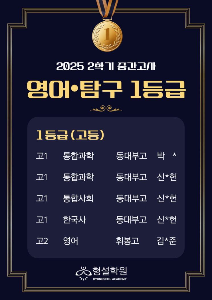 "통합과학1등급, 통합사회1등급, 한국사1등급, 영어1등급" 동대문구과학학원,장안동과학학원,동대문구사탐학원,장안동사탐학원,형설학원('25년 2학기 중간고사)