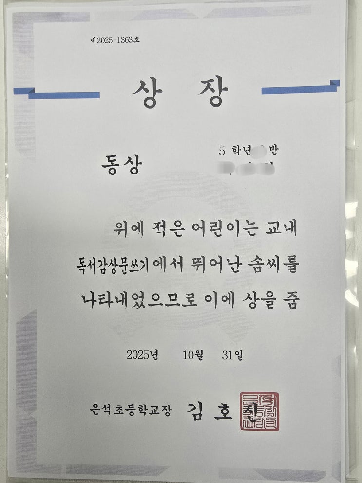 생각쟁이들이 상장을 받아왔네요~ 독서감상문쓰기 대회와 체험학습 보고서 쓰기 대회에서 동상과 금상을 받왔어요. 동상을 받은 친구는 더 잘 할 수 있었는데.....하는 조금 아쉬움이 있지만, 그래도 동상도 넘 잘 했어요.^^ <img src="https://blogthumb.pstatic.net/MjAyNTEyMTBfMjcw/MDAxNzY1MzY4ODE5Mzc4.jFgkKhKrRHA1EDBXbsy2-bN23ak9RBN0MX-OK1RJG00g.fm0C4Ah6gZTDgmoAGourwujH6Ro6n7ouaozU4GYRNVIg.JPEG/KakaoTalk_20251210_211150012.jpg?type=s3" />