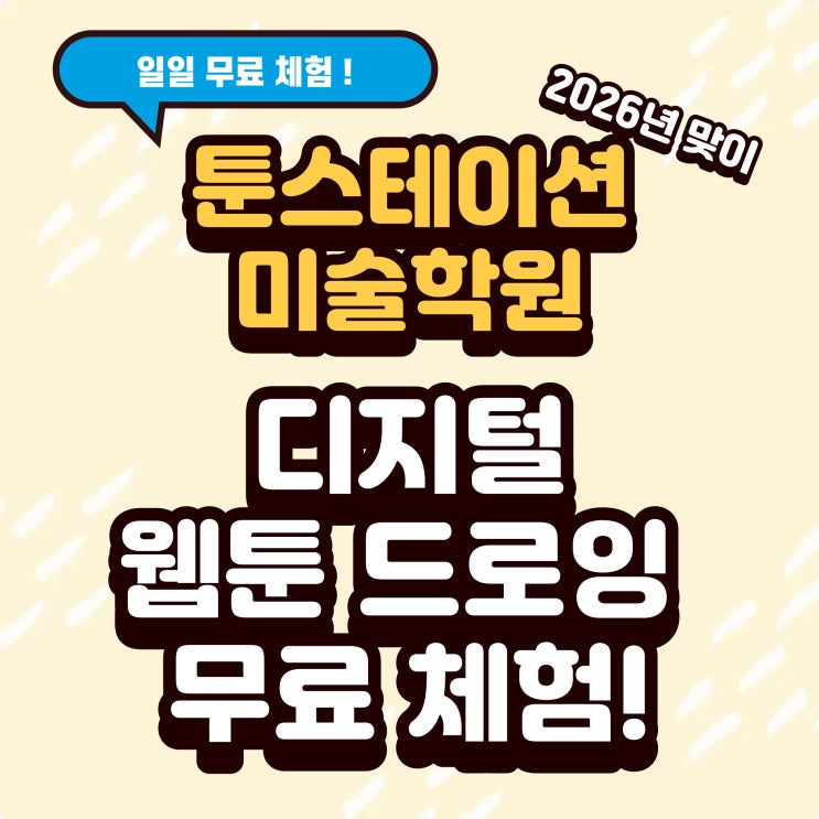 안녕하세요! 웹툰과 애니메이션을 사랑하는 학생들이 모인곳 툰스테이션 미술학원입니다. 평소 웹툰 작가를 꿈꾸거나 디지털 드로잉에 관심은 많았지만, 고가의 장비나 프로그램 때문에 망설였던 친구들 많죠? 2026년 새 학기를 맞아 우리 동네 중고등학생들을 위한 특별한 일일 무료 체험을 준비했습니다! ✨ 툰스테이션 일일 무료 체험 안내 정규 수업과는 완전히 다른 '순수 체험 코스'! 이번 체험은 학원 정규 수업과는 무관하게 운영되는 **[독립적인 체험 프로그램]**입니다. 수강 등록에 대한 부담 없이, 오직 디지털 드로잉의 즐거움을 느껴보는 시간이에요. 장소: 서울 동대문구 전농로 133, 3층 툰스테이션 미술학....... <img src="https://blogthumb.pstatic.net/MjAyNjAyMjFfMjMy/MDAxNzcxNjYwMDk4Nzc5.IMRenkVNxE5ad-iZa4JUUmNDJd1_HvahjC961_AmRN8g.9xFVIPEiBPXWrQ3ieeCG1t8hnX--D8tkAgUETeKXAxcg.JPEG/%C1%A6%B8%F1%C0%BB_%C0%D4%B7%C2%C7%D8%C1%D6%BC%BC%BF%E4._%281%29.jpg?type=s3" />