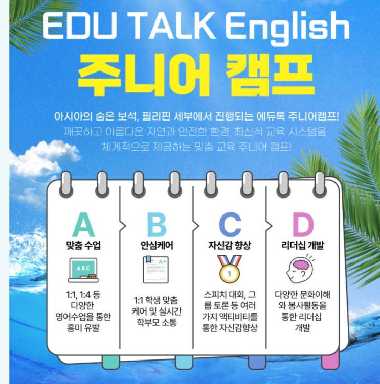 안녕하세요~ 연세CnC어학원 입니다. 오늘은 2026년 Cebu English Immersion Program에 대해 안내해 드리려고 합니다. 1. 글로벌 리더의 출발점, 세부 영어 몰입 연수란? 2026년 겨울방학동안 필리핀 세부에서 진행되는 4주 주니어 영어 몰입 연수 프로그램은 단순한 영어 학습을 넘어 자기 주도적 학습, 국제 감각, 다양한 문화 체험까지 경험을 할 수 있는 특별한 기회입니다. 2. 어학원 연계의 시스템 차별화 * 영어교육 전문가가 직접 검증한 세부 현지 실력파 어학원과 연계 * 내신 및 수능 특화 학습법 바탕의 효율적 커리큘럼 설계 *1:1 맞춤 수업, 소수 정예 그룹 클래스, 실전 회화 집중 트레이닝 *아이들의 안전과 건강을 최우선으로 한....... <img src="https://blogthumb.pstatic.net/MjAyNTExMThfMTI4/MDAxNzYzNDQzNzg1ODA3.AuEllK5wvll3pUQcka_Q7er8UO4QeE7uL0troObYA2sg.1VXK7YcTjOn63VMMvES9U51nNXhXRRxnEsl3kQevIu4g.JPEG/%C7%CA%B8%AE%C7%C9_%C4%B7%C7%C1_%BC%D2%B0%B3.jpg?type=s3" />