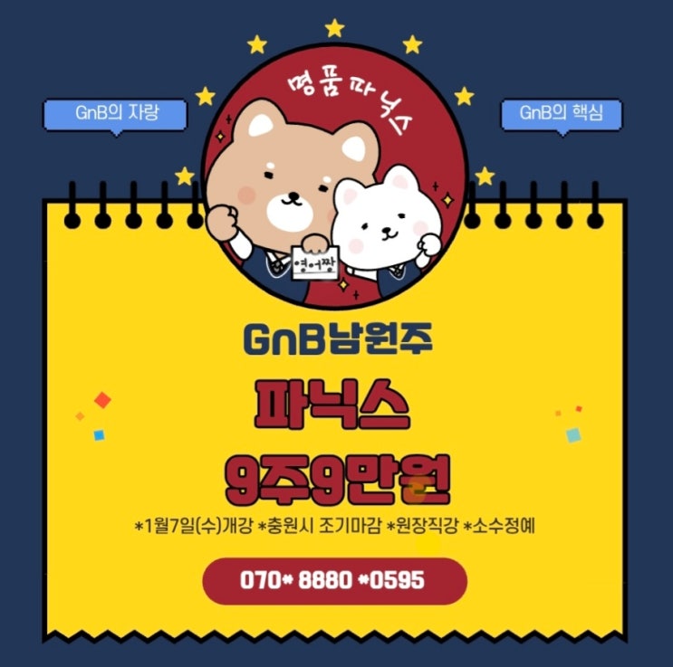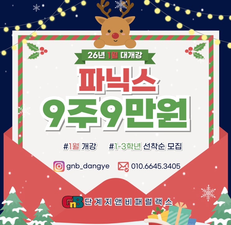 GnB 자랑! GnB의 핵심! 명품파닉스 9주9만원!! 매년 예약 조기마감으로 많은 학부모님께 아쉬움을 드린 GnB남원주 캠퍼스 파닉스 9주 9만원 예약접수를 시작합니다! ◇예약접수: ~12월 29일까지 ◇개강일:1월 7일(수요일) ◇오리엔테이션:12월15일 이후 접수순 진행 *본원생 가족및 소개 우선 *충원시 예비순위 부여 알파벳부터 차근차근 9주후 단어는 물론 문장을 읽는 명품 파닉스를 경험하세요 상담문의 ☎️070 8880 0595 GnB남원주캠퍼스(늘품로27 남원주초 맞은편 2층) 또는 네이버 톡톡으로 문의 주세요 #단구동영어전문학원 #구곡초영어학원 #남원주초영어학원 #GnB남원주캠퍼스 #원주지앤비 <img src="https://blogthumb.pstatic.net/MjAyNTEyMDFfMjI1/MDAxNzY0NTg2OTY5MzIz.RfDBB0NU4z26s8bc9XKxrr-ciBtjpEyx6x6g4IDFceYg.jrwy_yfoOsUAvDlREjtju5V9a4GjtUcy6kOQBwKxNykg.JPEG/900%A3%DFScreenshot%A3%DF20251201%A3%DF195509%A3%DFSamsung_Internet.jpg?type=s3" />