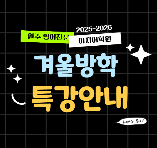 안녕하세요, 이지어학원 원주 겨울방학 특강 안내입니다. 이번 이지어학원 겨울방학특강안내는 이전 원주 예비중특강과 초등특강 겨울방학 영어특강안내의 종합버전입니다. 초등학생 겨울방학 특강 (3개) 1. 원어민 선생님 Speaking & Listening 특강 대상: 초등 1학년 ~ 4학년 (기본 레벨 학생) 주요 내용: 영어에 대한 흥미와 자신감을 키우는 '말하기' 훈련 원어민 선생님과 함께 즐거운 수업을 통해 듣기와 말하기 능력을 집중 향상 영어로 말하고 들으며 자연스럽게 훈련하고 익히는 과정 수업 시간/횟수: 매주 월요일, 1:20 ~ 2:20 (1시간) / 주 1회, 총 6회 기간: 1월 12일 (월) ~ 2월 23일 (월) 정원: 5명 (소수 정예....... <img src="https://blogthumb.pstatic.net/MjAyNTEyMDJfMjMx/MDAxNzY0Njc3MDU2Mjgz.woA7GthcdGgBw0bpqIdAxLPNU-7WrdGzWitVmdNsIQAg.Kantfno1be2FJLiNUc-9Fcs6yLTX9qIPaX7nQBBFRjog.PNG/image.png?type=s3" />