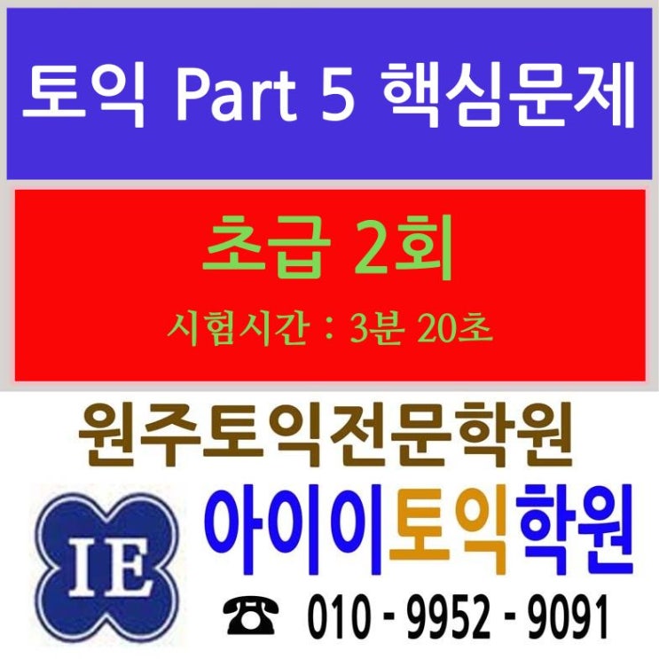 【원주토익학원 아이이토익】★토익 part 5 초급(2회) 10문제(3분20초)!!!★원주성인토익영어학원!!!