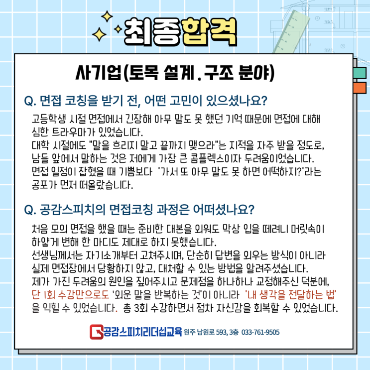 Q. 면접 코칭을 받기 전, 어떤 고민이 있으셨나요? Q. 수업 과정은 어떠셨나요? Q. 합격 소감 및 선생님께 한마디 #원주시면접코칭학원 #공감스피치 #면접코칭 #임용면접준비 #임용합격후기 #면접트라우마극복 #스피치리더십 #자기소개코칭 #면접자신감 #멘탈관리 #수업실연피드백 #면접연습 #면접멘토링 #면접컨설팅 #면접학원추천 #취업면접준비 #사기업면접 #토목설계면접 #구조분야면접 #최종합격후기 #면접코칭학원 #원주시학원 #면접합격비법 #면접스킬 #면접자신감회복 #면접코칭후기 #공감스피치학원 #면접준비학원 #면접합격전략 #면접멘토 <img src="https://blogthumb.pstatic.net/MjAyNjAyMjFfNzEg/MDAxNzcxNjQyNzM1OTIw.Adexa8V5ISxLpxIxTVKPeUBAC6lULruEnHqWjzJ4Yjog.1XGNrtr00QaIOaAF9bvYVY5zb-H5eudNuh8X4Dhv7TUg.PNG/2025%B1%B9%B0%A1%C1%F7-003.png?type=s3" />