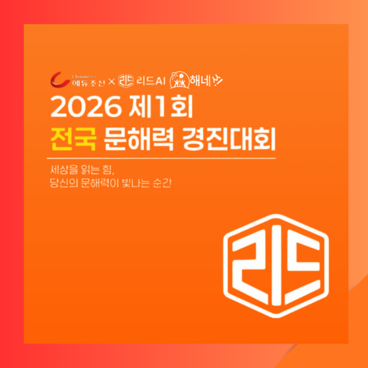 이 글 핵심 요약 ✅ 주관: 리드AI(비주얼캠프) + 에듀조선 ✅ 응시 기간: 2026. 3. 16(월) ~ 4. 16(목) ✅ 응시료: 30,000원 (문제집 2권 값) ✅ 장학금: 최우수 100만원 · 우수 50만원 · 장려 20만원 ✅ 면목동 해네쓰 공동 응시: 4월 4일(토) · 5일(일) 선착순 학생들 "금일이 금요일?"…문해력 논란 커지자 국교위 '문해력 특위' 만든다 뉴스1 · 김지현 기자 · 2026.03.15 오전 10:27 교사 10명 중 9명 '학생 문해력 저하' 체감…교육계 위기감 확산 ▶ 원문 기사 보기 → https://www.news1.kr/society/education/6100876 지금 우리 아이의 독해력, 객관적으로 측정해 보셨나요? 수학은 KMC, 성대경시, HME로....... <img src="https://blogthumb.pstatic.net/MjAyNjAzMTdfNTEg/MDAxNzczNzU0NjkzMDY2.wsc6GyBgGBETkBEVOlAzA9fpt40hP6ETTlIVnEsnsxUg.eX0i6bs6pkg5xut1e68oYgl_0ijfUCTB7ks1wMUsb-Qg.PNG/1.png?type=s3" />