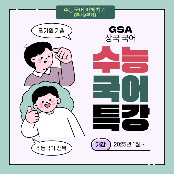 "수능 국어 파헤치기(독서+문학)" 어려운 수능 국어 대비 겨울방학 특강 (강사 : 김동훈 선생님) ▶ 대상 : 2026학년도 고3 (모의고사 3등급이내 학생) ▶ 기간 : 6주 예상 (총 12회, 독서 7~8회, 문학 4~5회) ▶ 목표: 평가원 기출 잡고 수능 국어 정복을 시작하자! ▶ 교재: 자체 편집 교재 ▶ 상셰 계획 수업 방식 : 개념 집중 + 문제 적용 병행 <img src="https://blogthumb.pstatic.net/MjAyNTEyMDhfMjgy/MDAxNzY1MTg4OTkwNzg4.rp75pUhW1iJsghj5k5zPpCGno3hWSCfdLHUMxNPLxvMg.KVG4LbwAoaxtc4KiZtbFmxmr0bz1rPCS-lMqHmyDvbUg.PNG/2026%B0%DC%BF%EF%B9%E6%C7%D0%C6%AF%B0%AD%BE%C8%B3%BB_%285%29.png?type=s3" />