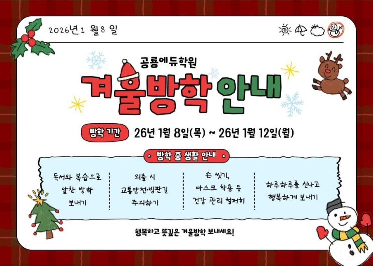 안녕하세요! 공룡에듀학원입니다:) 1월 8일(목)부터 1월 12일(월)까지 겨울방학입니다. 1월 13일(화)부터 정상 수업이 시작됩니다. ( 꼭 등원해야해....☺️) 방학 동안 충분히 쉬고 개학 후 다시 만나요! 감사합니다 따뜻한 겨울 보내세요 ☃️❄️ 방학중에도 상담문의 가능합니다. 010-6608-4054 연락주세요^^ #용암동학원 #동남지구학원 #동남지구수학 #동남지구영어 #용아초학원 #동남지구국과사 #더클립 #용아초 #운동초 #교동초 #상당초 #용아중 #용성중 #청운중 #운동중 #금천고 #동남지구파닉스 #용암동영수학원 #동남지구전과목 #동남중등전과목 #겨울방학 <img src="https://blogthumb.pstatic.net/MjAyNjAxMDdfNjcg/MDAxNzY3Nzg4NzQ4NDY2.Zxm4S3OSH0mh1u9Rb0uVQgFicZzFkBAY-fij0rIlKkEg.VK4I8oJlTXxbzGW9U0mjVwAhyl-ZFK3DWt7veiLXFq4g.JPEG/IMG%A3%DF8970.JPG?type=s3" />