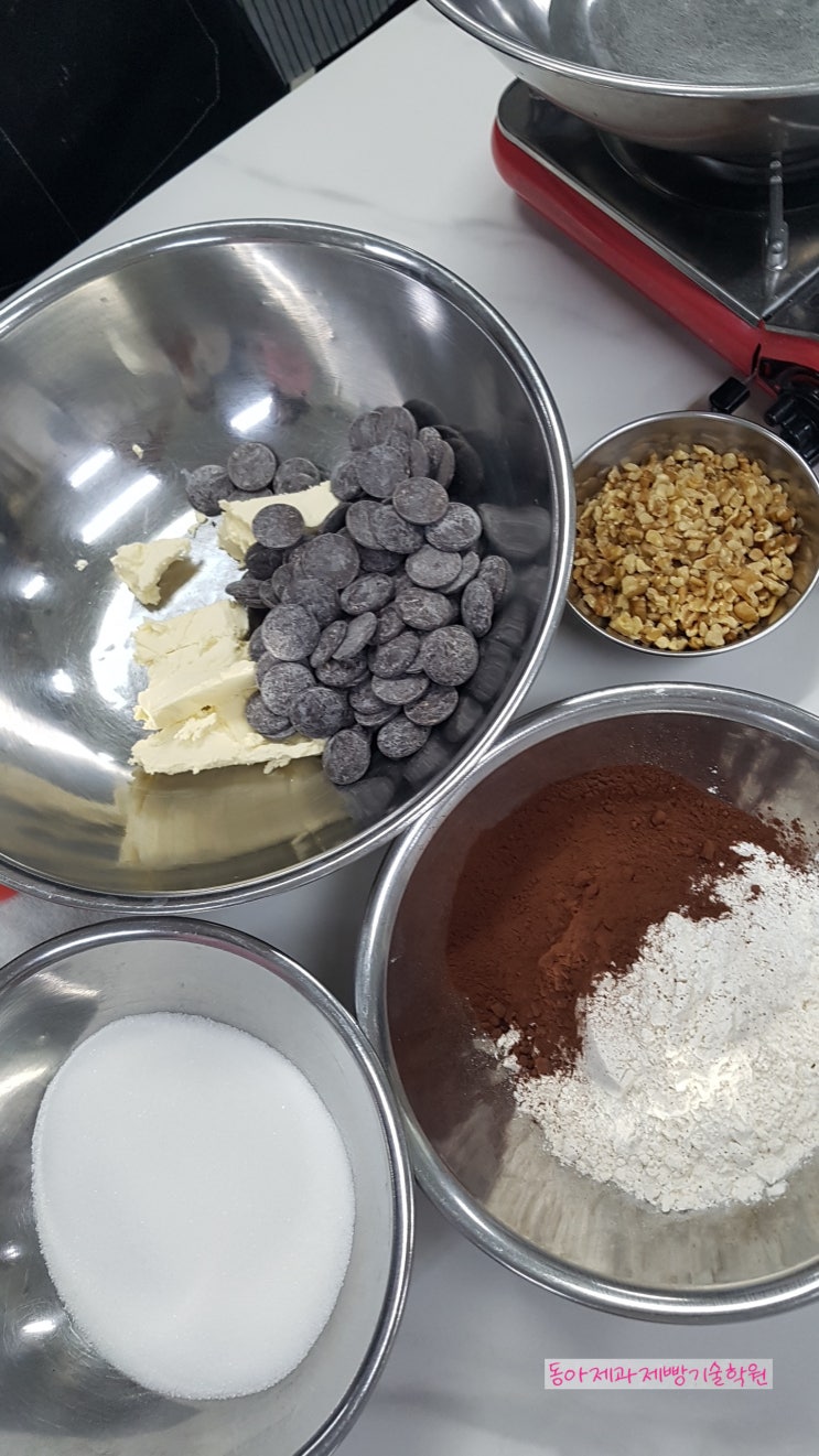 학생분들이 만든 브라우니,버터쿠키 브라우니를 제조하여 제출하시오. 1) 배합표의 각 재료를 계량하여 재료별로 진열하시오(9분). 2) 브라우니는 수작업으로 반죽하시오. 3) 버터와 초콜릿을 함께 녹여서 넣는 1단계 변형반죽법으로 하시오 4) 반죽온도는 27℃를 표준으로 하시오 5) 반죽은 전량을 사용하여 성형하시오 6) 3호 원형팬 2개에 패닝하시오 7) 호두의 반은 반죽에 사용하고 나머지 반은 토핑하며, 반죽속과 윗면에 골고루 분포되게 하시오(호두는 구어서 사용) 동아제과제빵, 브라우니, 드롭다크, 커버춰, 버터쿠키, 제과기능사, 제과자격증, 제빵기능사, 제과제빵자격증, 제과제빵학원, 영등포제과제빵학원, 동아제과제빵기술학원....... <img src="https://blogthumb.pstatic.net/MjAyNjAxMTJfMjgz/MDAxNzY4MTk0MjY5MDY4.uwyHQw1KeE5-nI9fvaUe4ggzZgI8uvcoO-kNQG3XQbQg.VTlOFEvY_VPtorGYt007GtwFurkjFZpXnkatoSu0xrwg.JPEG/20260112_100320.jpg?type=s3" />