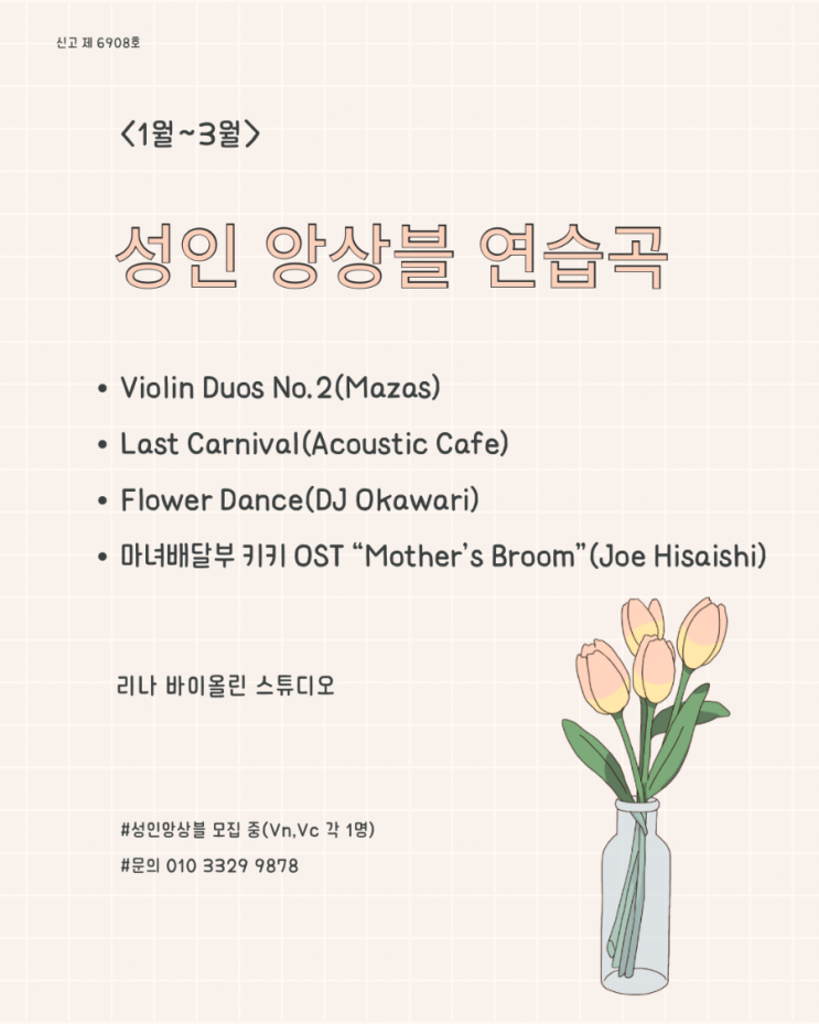 안녕하세요.1~3월 새 연습곡으로 성인 앙상블 모집합니다.월2회, 90분 수업으로 주말을 이용하여 원하는 레퍼토리를 정하고 함께 연주하는 즐거움,새로운 곡을 탐구하고 알아가는 즐거움(곡에 대한 해설)과 힐링을 목적으로 하고 있습니다.곡 완성 후 피아노 반주와 함께 영상찍고 비공개 밴드에 업로드 됩니다.무료 체험 수업 가능하고 문의 환영합니다.26년에는 바이올린 1분,첼로 1분 더 모십니다. #라스트파니발#플라워댄스#엄마의빗자루 <img src="https://blogthumb.pstatic.net/MjAyNjAxMDlfNDIg/MDAxNzY3OTE4MjI1NDgy.8vfz6fSLsIIs8M56G87NjCJAfl2AkLbhp7lUZi4IeXQg.tnyGrjPokazjc43h8NXhfcK0nqS_YEC3XzWn1kW8754g.PNG/900%A3%DF1767918178918.png?type=s3" />