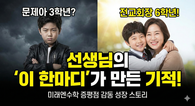 안녕하세요. 아이들의 마음까지 어루만지는 교육, 미래엔수학입니다. 오늘은 우리 교실의 아주 사소하지만, 증평교실에 너무나 특별한 성장 스토리를 하나 들려드릴까 합니다. 수학 공식 하나를 더 외우는 것보다 아이의 마음을 얻는 것이 교육의 진짜 시작임을 다시금 깨닫게 해 준, 어느 남자아이의 이야기입니다. 초등학교 3학년, 가시 돋친 첫 만남 그 아이가 처음 우리 학원 문을 열고 들어왔던 때가 기억납니다. 지금은 의젓한 초등학교 6학년이 되었지만, 3년 전, 초등학교 3학년이던 그 아이는 사실 꽤나 '유명한' 아이였습니다. 다른 학원 선생님들조차 고개를 절레절레 흔들며 힘들어하던 아이였죠. 선생님을 조금은 쉽게 보....... <img src="https://blogthumb.pstatic.net/MjAyNTEyMDhfMTQ3/MDAxNzY1MjA1MzE1OTU3.oWihz4oTEYYPTJTDcVksHVa0ctvQgTdmL1ujk6pVWscg.BF4ejR7I6ayFqPrG-9pucG6vncG3g-Xfbw5Egk0YPKQg.PNG/Gemini_Generated_Image_m2z0atm2z0atm2z0.png?type=s3" />