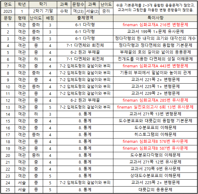 ★ 위 표는 유사출제가 중복된 경우, 교과서 > 학교 프린트 > 파인만 내신교재 순서로 기재했습니다. 2025년 압구정중 1학년 2학기 기말고사 수학 시험은 객관식 23문항에 서술형 2문항으로 문항수는 다소 많은 편이었으나 압구정중으로서는 이례적일 정도로 전체적인 난이도가 쉬운 편이어서 체감시간은 부족하지 않았습니다. 우선 시험에 대한 주요 포인트를 정리해보면, ☆ 1) 교과서를 기반으로 변형하거나 융합된 문항들이 많았다 이번 압구정중 1학년 2학기 기말고사는 교과서를 기반으로 출제되긴 했으나 도형 파트는 거의 그림만 차용하고 다른 문제로 여겨질만큼 많이 변형해서 출제되었으며, 대부분 교과서 수준의 쉬운 기본 문....... <img src="https://blogthumb.pstatic.net/MjAyNTEyMDlfMTMy/MDAxNzY1Mjc0NDcyMzM2.mfT5UnQAzvUXQnj1Tmsu3k6QjzeNTtDb3_anorgSE6Ig.TPhKPMBE4mG66cybs5s3QZ0AgqH3Hg-ZeeqgzvwQfj8g.PNG/image.png?type=s3" />