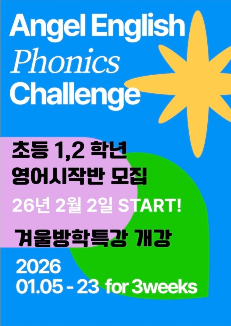 초등 1·2학년 영어 시작반 모집 중 Angel English Phonics Challenge 첫 수업 : 2026년 2월 2일(월) 시작 영어의 시작은 빠른 선행이 아니라 기초를 얼마나 정확하게 쌓느냐에 달려 있습니다. 엔젤영어학원 초등 1·2학년 영어 시작반은 파닉스 학습을 중심으로 원서 읽기까지 자연스럽게 연결되는 수업으로 아이들의 영어 첫 출발을 책임집니다. 현재 신학기 대비 모집 중입니다. --- 영어 시작, 왜 파닉스 + 원서 읽기인가요? 파닉스는 알파벳과 소리를 연결해 스스로 읽는 힘을 만들어 주는 학습입니다. 하지만 파닉스가 단어 연습에서만 끝나면 아이들은 “배운 것”과 “읽는 것”을 연결하지 못하는 경우가 많습니다. 그....... <img src="https://blogthumb.pstatic.net/MjAyNTEyMTdfOTEg/MDAxNzY1OTIzNjk0Njc1.n-wjEBnlVIEh-JyhdmaXH8ehHRQE16EiIlV5X0QuV30g.T6xoQ10H0ZvfwRpUMlkg__dA6v9Bl0diQ0BQtefmQ1Qg.JPEG/900%A3%DFScreenshot%A3%DF20251217%A3%DF070354.jpg?type=s3" />