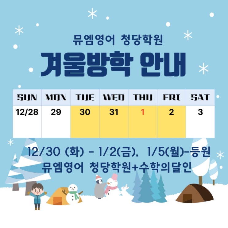 안녕하세요, 뮤엠영어입니다. 우리 학원은 12월 30일부터 1월 2일까지 겨울방학을 진행합니다. 잠시 학원 수업은 쉬어가지만, 모두가 그동안 열심히 달려온 만큼 이번 휴식 기간만큼은 마음 편히 쉬며 즐겁게 보내길 바랍니다. 충분한 휴식은 다시 집중할 수 있는 에너지를 만들어 줍니다. 방학 동안 가족과 함께 따뜻한 시간 보내시고, 스스로를 돌아보며 재충전하는 시간이 되길 바랍니다. 방학이 끝난 후에는 더 밝고 건강한 모습으로 만나, 이어지는 긴 겨울방학 동안에도 목표를 향해 꾸준히 공부할 수 있도록 함께 노력하겠습니다. 새로운 한 해도 우리 아이들이 성장할 수 있도록 최선을 다해 지도하겠습니다. 감사합니다. <img src="https://blogthumb.pstatic.net/MjAyNTEyMDlfMTQw/MDAxNzY1MjA2NTc4MTQ5.to49j9g8eD0oH1LZF8o6iAmICjVijeffyvwqlTh81CQg.Dc5pCUZtdCY5aEzD78T4tQUmyyMj0kuiCezY9cP6C7sg.JPEG/900%A3%DF1765195182994.jpg?type=s3" />