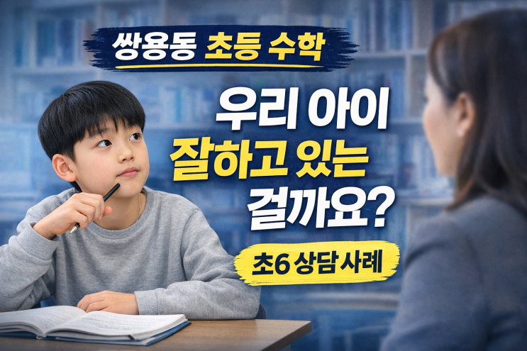 안녕하세요 천안 쌍용동 수학학원 수학의정석 원장 한용기입니다. 초등 6학년 상담을 하다 보면 이 질문을 자주 받습니다. "우리 아이, 잘하고 있는 걸까요?" 느린 걸까요, 문제 있는 걸까요 쌍용동 초등6학년 학생 이야기입니다. 문제를 푸는 속도가 조금 느린 편입니다. 하지만 한 가지 분명한 건 혼자서 끝까지 풀어보려는 노력은 하는 학생입니다. 이건 쉽게 만들어지는 습관이 아니라서 좋게 보고 있는 부분입니다. 집중력과 표현의 문제 다만 수업을 하다 보면 조금 아쉬운 부분도 있습니다. 집중력이 살짝 흔들릴 때가 있고 문제가 잘 안 풀리면 혼자 중얼거리면서 고민하는 경우가 있습니다. 이때가 중요한 타이밍입니다. 질문....... <img src="https://blogthumb.pstatic.net/MjAyNjA0MDFfNDkg/MDAxNzc1MDMwNDAzMDA1.U56gGotVZMErDIVAl7E4nEcoYwlC3ZNePXMyAONOwC0g.I1J09srlV29lmGrKLEC71tbyeZyTCcgOgUyhTOhxVqcg.PNG/ChatGPT_Image_2026%B3%E2_4%BF%F9_1%C0%CF_%BF%C0%C8%C4_03_24_15.png?type=s3" />