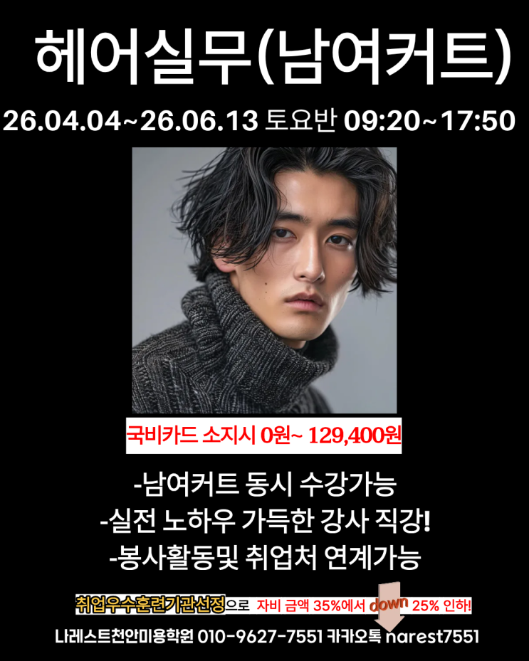 안녕하세요 나레스트천안미용학원 입니다. 헤어실무(남여커트) 26.04.04~26.06.13 토요일(주1회) 09:20~17:50 천안남여커트 과정이 인기 있는 이유 요즘 미용 분야에 대한 관심이 높아지면서 전문적인 기술을 배우려는 분들이 많아지고 있습니다. 그중에서도 천안남여커트 과정은 남성과 여성 커트를 동시에 배울 수 있어 효율적인 교육으로 주목받고 있습니다. 하나의 과정으로 두 가지 기술을 모두 익힐 수 있기 때문에 시간과 비용을 절약할 수 있다는 점이 큰 장점입니다. 남여 커트를 동시에 배우는 실전 커리큘럼 이번 천안남여커트 수업은 남성과 여성 커트를 분리하지 않고 통합적으로 교육합니다. 이를 통해 다양한 스타일을 빠르게 이....... <img src="https://blogthumb.pstatic.net/MjAyNjAzMzFfMjUy/MDAxNzc0OTM4MzYzNDUx._IvcV8tQo5vqFPdofp0MDPMEx8elNk858UcyApmwSR0g.ibK5X9TNBbwq6JWw0dIjXWA__RffFsaJn65LSJvHKEIg.PNG/%C1%A6%B8%F1%C0%BB_%C0%D4%B7%C2%C7%D8%C1%D6%BC%BC%BF%E4..png?type=s3" />