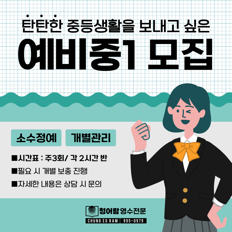 벌써 새학기 준비에 한창인 발빠른 청어람! 보다 탄탄한 중등생활을 보내고 싶은 예비중1 학생분들을 모집합니다. 수업 관련한 자세한 사항은 상담을 통해 알아보실 수 있습니다. 얼마든지 문의주세요! ■ 전화 문의 : 02-995-0979 ■ 카카오톡 채널 문의 : @청어람영수전문 <img src="https://blogthumb.pstatic.net/MjAyNTEyMDRfMTc3/MDAxNzY0ODM0Mzk0ODcw.05t5rZ0jTO8fl9U2NDgm1fi2tP-PvLVEEmS-jUjCkRUg.sEe6T-goiOY70sYKqK9UFazj35DXx-0ikB2Qt7ndxe4g.PNG/1.png?type=s3" />