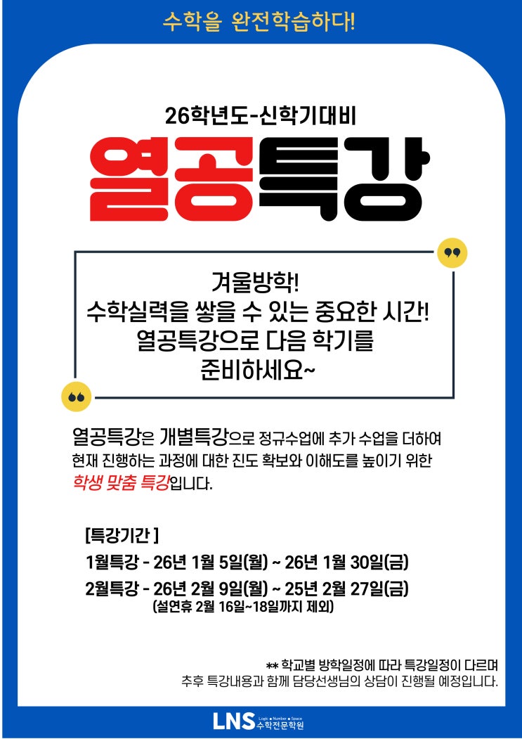 수학을 완전학습하다! LNS수학학원에서 다음 학기 대비를 위한 열공특강을 준비했습니다. 상세일정은 담당선생님이 학생별로 상담 진행 할 예정입니다. 1월 특강 신청은 25년 12월 24일(수)까지 2월 특강 신청은 26년 1월 23일(금)까지 신청해주시기 바랍니다. ★★★ 열공특강은 LNS 재원생만 신청가능합니다. ★★★ #방학동수학#창동중#도봉중#자운고#창동고#용화여고#정의여고#상계고#창도초#자운초 <img src="https://blogthumb.pstatic.net/MjAyNTEyMTBfMjQ5/MDAxNzY1MzYxNTE1OTQ5.UrWX_8NR26sS9vWhIgavNs8NwLPipUyt8mLdkbMES-Yg.EWKmM9z-SDgbMmWFxciARMdxyAUfivFrwWkXobodIpog.JPEG/003_%2811%29.jpg?type=s3" />