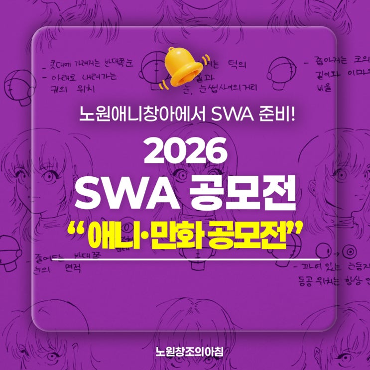 안녕하세요. 노원웹툰학원 노원애니창아입니다. 노원애니창아에서 알려드는 SWA 공모전 내용! 미대입시 홈페이지에서 온라인 접수를 하고 있습니다. SWA 서울웹툰아카데미는 실기가 반영되는 학교로 노원창조의아침 미술학원에서 준비 가능합니다. 전국 예비 고등학생 중 3과 고등학교 재학생 및 졸업생 모두 참여 가능합니다. 검정고시생들도 참여 가능합니다. 2026년 4월 20일 월요일부터 6월 26일 금요일 오후 5시까지 접수 가능합니다. 이 안에 우편접수 작품은 출품해야 합니다. 참가비는 25,000원입니다. 엠굿 미대입시 홈페이지에서 온라인 접수합니다. ▼ 2026 SWA 서울웹툰아카데미 공모전 ▼ 응모분야 칸만화, 상황표현, 이미지보드는....... <img src="https://blogthumb.pstatic.net/MjAyNjA0MDFfMjcg/MDAxNzc1MDI4MjAxNTky.UWB-qL6BV2mmvDqIhxEGfHa9tpKq9CMdw1Xv0FlLIuMg.qfgMqsQ1WCgL8piqPqYRsigOOSeD2qz7Tfun3LG-PxMg.JPEG/2026_SWA_%B0%F8%B8%F0%C0%FC_%282%29.jpg?type=s3" />
