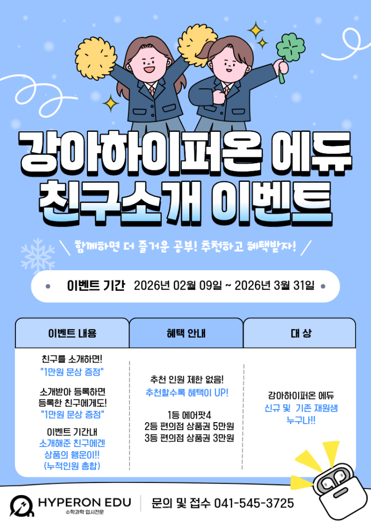 하이퍼온 에듀 수학학원 친구소개 이벤트 안내 안녕하세요. 하이퍼온 에듀입니다! 공부는 함께할수록 더 즐겁고, 더 오래 가는 힘이 있죠. 그래서 하이퍼온 에듀에서 우리 친구들이 좋은 공부 환경을 함께 나눌 수 있도록 친구소개 이벤트를 준비했습니다! 친구소개 이벤트 혜택 · 소개한 친구 → 문화상품권 1만원 증정 ·소개받고 등록한 친구 → 문화상품권 1만원 증정 즉, 서로 모두 혜택을 받는 이벤트! 누적 소개 이벤트 (대박 포인트!) 이벤트 기간 동안 친구를 누적해서 가장 많이 소개해 준 학생 1명에게는 에어팟 증정! “한 명 소개하고 끝”이 아니라 소개할수록 당첨 확률이 높아져요!! 2등 5만....... <img src="https://blogthumb.pstatic.net/MjAyNjAyMDRfOTYg/MDAxNzcwMTkwMTM4MzMw.5e0qqgp17NaGwAAQOPeCc59SC_Szm3QdCk8B8cezLM8g.ttpXsXGnfoQfGkHGyPnlSM7fG1TXZcqC70S_pPmuQrUg.PNG/%C1%A6%B8%F1%C0%BB_%C0%D4%B7%C2%C7%D8%C1%D6%BC%BC%BF%E4._%2811%29.png?type=s3" />