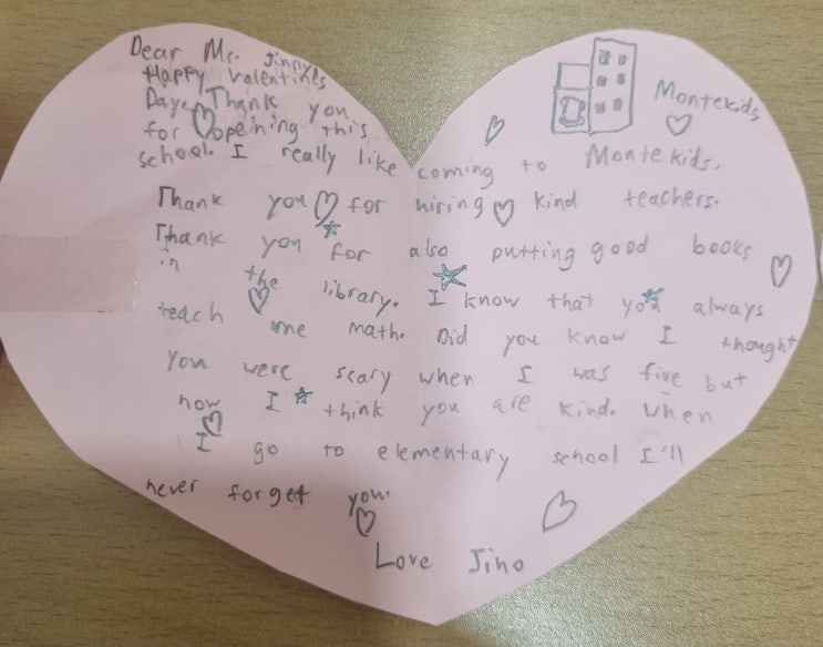 지난 주 Valentine’s Day, 사랑이 가득한 몬테키즈 교실에서 평생 잊지 못할 순간이 있었습니다. 졸업을 앞둔 우리 몬테키즈 친구들이 두 손을 꼭 모아 하트 카드를 건네며 말했어요. “Open it, Ms. Jinny.” 아이들이 한 장 한 장 정성껏 쓴 편지를 길게 이어 붙여 하나의 작품처럼 만들어 주었답니다. 목에 걸어보라며 깔깔 웃고, “I love you” 하며 따뜻하게 허그해주는 그 순간… 몬테키즈 교실은 그 어느 때보다도 따뜻한 사랑으로 가득 찼습니다. “I am very sad to leave Montekids…” 첫 번째로 읽은 카드에 적혀 있던 문장입니다. “I am very sad to leave Montekids… Thanks to you, I learned a lot while having fun.”....... <img src="https://blogthumb.pstatic.net/MjAyNjAyMjBfNzMg/MDAxNzcxNTg5NjYwMDQw.IsRfr0DrFPzEyi66tua0JSzv9beDyMZ8kIi3m4Fw11Ag.OecDVcf9XdoHMap729vrIbJextd5u7_K7MLgghwut9wg.JPEG/20260220_200030.jpg?type=s3" />