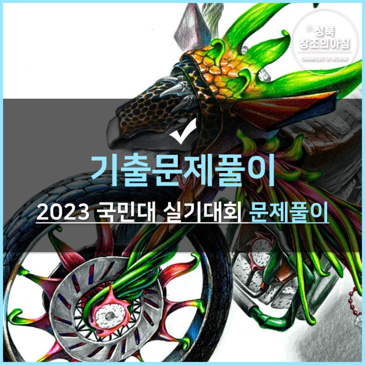 안녕하세요. 성북창조의아침 미술학원입니다. 오늘은 2023 국민대 실기대회 주제였던 문제를 풀어보는 시간을 갖도록 하겠습니다. 먼저 2023 국민대 실기대회 주제를 보도록 하겠습니다. 곧 다가오는 2026 국민대 실기대회는 5월에 예정되어 있습니다. 그때까지 달려보자고요! 2023 국민대 조형대학 실기대회 주제 국민대 실기대회 기초조형 주제입니다. 용과와 아르마딜로가 나왔습니다. 해당 제시물을 이용해서 오토바이 2개를 그리시오라는 주제가 출제가 되었습니다. 용과의 형태와 아르마딜로의 형태, 그리고 특징을 살펴보면서 아이디어 스케치 단계를 들어갑니다. 오토바이에 어떻게 접목시킬 수 있는지를 구상하고 표현합니다. 아이디어....... <img src="https://blogthumb.pstatic.net/MjAyNjAyMjBfOTEg/MDAxNzcxNTYxNjA0ODc5.k3d-6I3frLnY1fWLFprcmp8bAwADwogIgPkRe1Q8BiUg.4b0JoX5N8yLS-OPEfSWUGUj3habCtMlijIA2c0RmlRAg.JPEG/2023_%B1%B9%B9%CE%B4%EB_%B1%E2%C3%CA%C1%B6%C7%FC_%B9%AE%C1%A6%C7%AE%C0%CC_%281%29.jpg?type=s3" />
