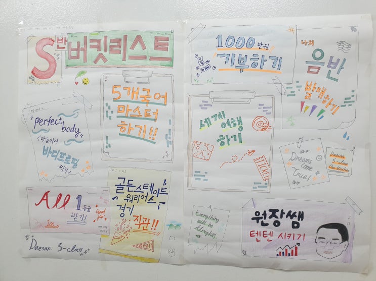 우리들의 소중한 꿈!!! 버킷리스트!!! 텐텐학습 프로그램 중 하나인 버킷리스트 작성하기!!! "죽기전에 꼭 해야 할 일 또는 하고 싶은일들"을 기록해보는 버킷리스트 작성하기를 올해도 반별대항으로 진행하였습니다. 버킷리스트 내용들이 진지하고, 또는 장난스러운 내용들도 있지만, 우리 원생들이 하고 싶은 일들이기에 모두 소중합니다. 협동심도 기르고 친구들과 담화도 나누며 각자의 재능을 발휘해 작품을 만들어 가는 모습들이 너무도 진지하고, 행복해 보였습니다. 공부도 열심히!!! 작품을 만드는 일도 열심히!!! 우리 원생들은 무엇이든 항상 열심히 최선을 다 하는 멋진 사람들입니다. 처음 텐텐을 시작할 때는 6주동안의....... <img src="https://blogthumb.pstatic.net/MjAyNjAyMjFfMjQ2/MDAxNzcxNjAzMDU2MTI4.F7-kuFeXpRflE0bHI7RYPZvwlRyp5bTrMp20PiARpTEg.YQ6gQNZe6svGa1dpjWFedMqIHe_D97Xa0NCYNDJ3sr4g.JPEG/20260219_195050.jpg?type=s3" />