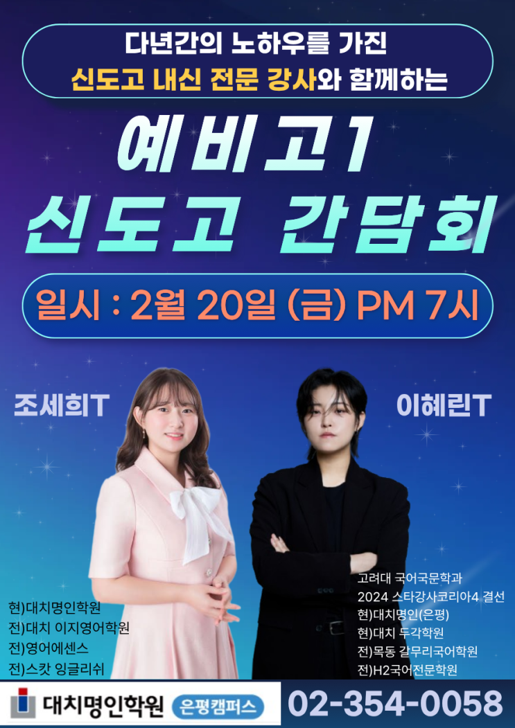 은평명인학원에서 예비고1 신도고 학생들을 위한 간담회를 개최합니다! 다년간의 노하우로 신도고 내신을 전문적으로 하신 국어 이혜린T와 영어 조세희T와의 만남 학교별 시크릿 자료까지 준비되어 있습니다~ 많은 관심 부탁드립니다! 일시 : 2/20 [금] PM 7시 [ 신도고1 간담회 예약하기 ] ▶ 전화 예약 : 02-354-0058 ▶ 문자 예약 : 010-6221-0052 ( 신도고1 간담회 / 학생이름 / 연락처 ) ▶ 네이버 예약 : https://naver.me/xydMwU6d 영어 조세희T 현)대치명인학원 전)대치 이지영어학원 전)영어에센스 전)스캇 잉글리쉬 국어 이혜린T 고려대 국어국문학과 2024 스타강사코리아4 결선 현)대치명인(은평) 현)대치 두각학원 전)목동 갈무리국....... <img src="https://blogthumb.pstatic.net/MjAyNjAyMDRfMjc4/MDAxNzcwMTcxMTAxNDY5.dxHIXgKfDF5oCQSA84RqhmndaK6jH_4Yfm6NjgOBhJMg.B7U3LUFsX_LlAlwBxdHChoXIBtaoEPZdLDve4GdUyn4g.PNG/%BD%C5%B5%B5%B0%ED_%B0%A3%B4%E3%C8%B8.png?type=s3" />