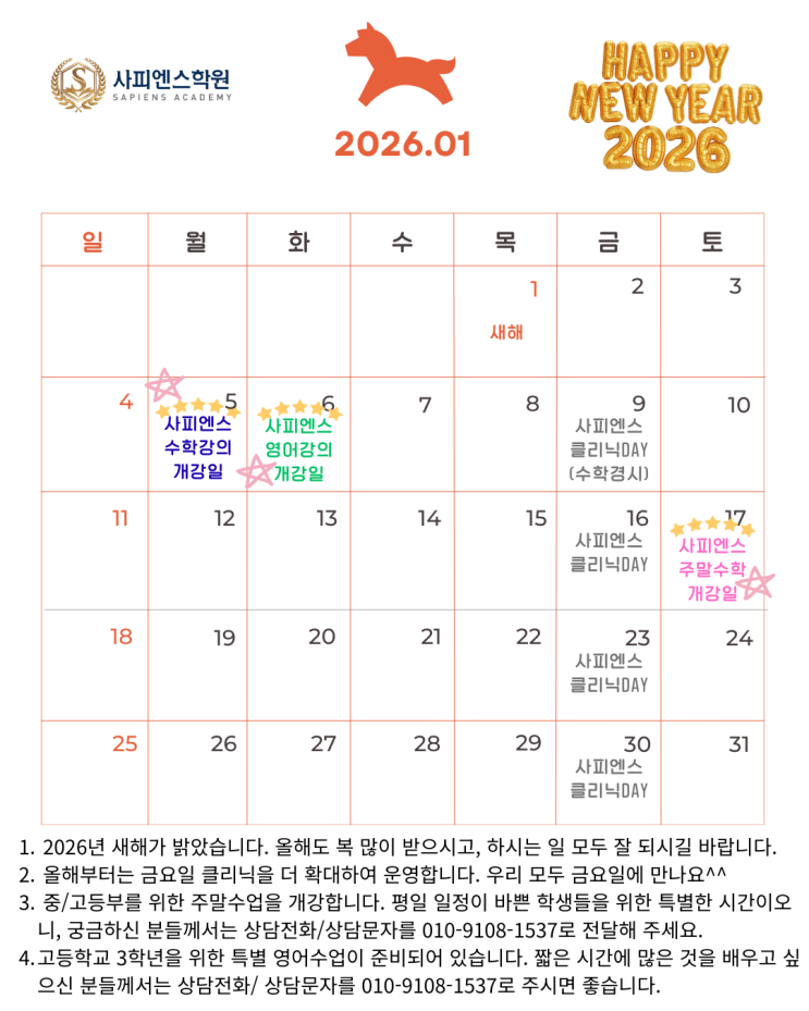 안녕하세요. 사피엔스학원입니다. 먼저, 새해 복 많이 받으세요^^ 각 가정의 건강과 평안, 그리고 하시는 일이 모두 잘 진행되길 기원합니다! 우리 사피엔스 학원에서는 2026년을 맞이하여 새로운 강의를 추가 개설하여 알려드립니다. 1월 17일부터 중/고등학생을 위한 주말 수학 수업이 진행될 예정입니다. 또한, 시간이 부족한 고등학교 3학년 학생들을 위한 수능 대비 특별 영어강의도 진행됩니다. 관심 있으신 학생, 학부모님들께서는 학원 번호로 언제든 연락 주시면 세부 안내가 가능합니다. [상담전화] 02) 824-5080 010-9108-1537 (수업 중 일 때에는, 수업 후 따로 연락드리겠습니다.) <img src="https://blogthumb.pstatic.net/MjAyNjAxMDRfMjUw/MDAxNzY3NDY5MTM3Nzkz.iFQVpYDOQqR2BjMUJW71c8kU_fLT3GUjjv-i_lXiEq4g.o7AR68SUYNj1pciaSClAQLMW8asqnTtY9E1zXapfHokg.PNG/빨간색_단순_말의_해_캘린더_-_인스타그램_게시물.png?type=s3" />