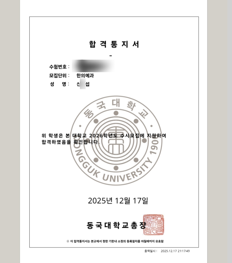 26년 대입 충암고3 동국대 한의대 최종 합격