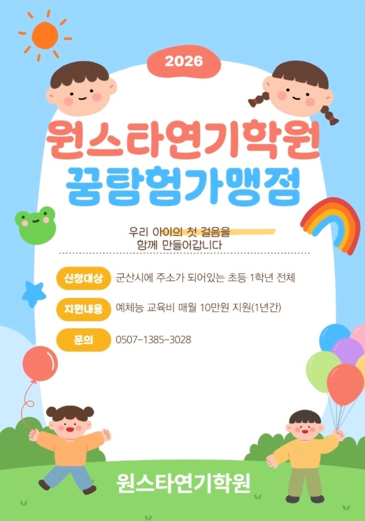 군산시 우리아이 꿈탐험 지원사업 안내 ✅ 지원 대상 •군산시에 주소가 되어 있는 2019년생 초등학교 1학년 자녀 전체 지원 내용 •우리아이 꿈탐험 지원사업’ 교육비 1년간 (2026.03 ~ 2027.02) 매월 10만 원씩 지급 •바우처 카드 포인트로 지급되어 지정된 가맹점에서 자유롭게 사용 가능 신청 기간 2026년 2월 9일(월) ~ 2월 13일(금) 신청 장소 아이 주소지 읍·면·동 행정복지센터 ▶ 사용 개시일 2026년 3월 4일(수)부터 ☎ 문의 전화 063-463-1121 해뜨래 음악학원은 군산시 우리아이 꿈탐험 지원사업 가맹점으로 바우처 카드 사용이 가능합니다 <img src="https://blogthumb.pstatic.net/MjAyNjAyMDlfMTAz/MDAxNzcwNjM5NTAwMTc1.UtTs_uWpOnAOoyUGXW_C9-CHf9I7Gk4XMItKWtPvKQEg.RLjo8gThz4M3gf_V74ls09HVb3rrppPhkzWnjftnuVIg.PNG/IMG%A3%DF1912.PNG?type=s3" />