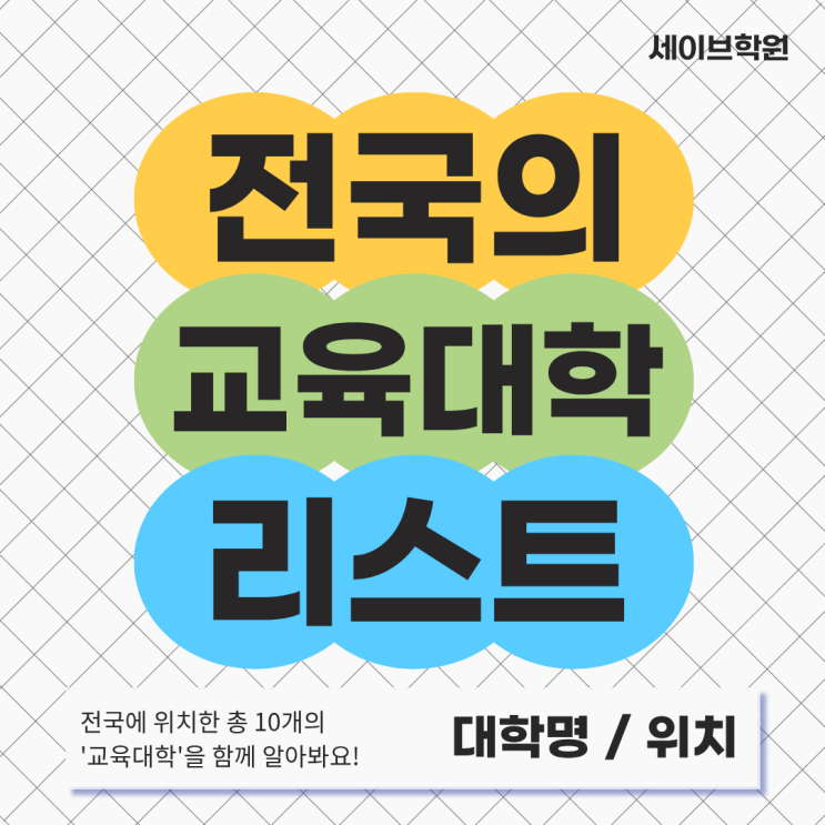 안녕하세요, 세이브학원입니다. 어느새 겨울방학의 끝자락, 2월이 눈앞입니다. 슬슬 새 학기가 시작된다는 것에 체감이 되며, 이번 학기는 어떻게 공부해야 하지, 하는 생각이 머릿속을 채우는 시기죠. N수생 학생이라면 벌써 26년의 한달이 지나버린 것에 더욱이 놀랄 수 있을 것도 같고요. 벌써 제목을 보고 이 포스트를 클릭하셨겠지만, 오늘은 전국의 교대 리스트를 함께 살펴보고자 합니다. 특히 초등교사가 꿈인 친구들은 교육대학교(교대)에 대해서 한 번쯤 진지하게 검색해 보셨을 거라 생각하는데요. 우리나라의 교육대학은 「고등교육법」에 따라 초등학교 교원을 양성하는 것을 목적으로 둔 국립 4년제 대학입니다. 초등 2급 정교사 자....... <img src="https://blogthumb.pstatic.net/MjAyNjAxMjVfMTc0/MDAxNzY5MzQwNjI5OTU4.CTGA0z2zGBrXAQzcn2dx6J_SnAJJtJg6WIVyfUZaLccg.iY9yy44PtdcD3bNIOUFYngRvdmkgCitJ52x9yjHbY14g.PNG/%C1%A6%B8%F1%C0%BB_%C0%D4%B7%C2%C7%D8%C1%D6%BC%BC%BF%E4._%288%29.png?type=s3" />