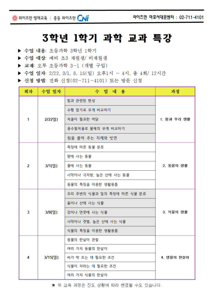 안녕하세요~ 와이즈만 마포센터입니다! ^^ 초등 3학년부터 시작되는 과학 과목~ 와이즈만에서 함께하면, 실험도 즐겁게~ 개념도 자신 있게 공부할 수 있어요! 2~3월에 열리는 일요 특강, 함께 공부해요! ^^ 문의 및 접수 02 711 4101 감사합니다 #와이즈만마포센터 #초등과학 #중등과학 #탐구실험 #과학개념 #일요특강 <img src="https://blogthumb.pstatic.net/MjAyNjAxMzFfOTUg/MDAxNzY5ODU3MDA5MzA1._qVlJPuKpXxxdpul_cIEGF1KeDkfBRGC0xak2f0WQsQg.VGHgoaQsW48OakP020N3Jj9zxpxMHaeSJJydDfMFyTEg.PNG/2026%B3%E2_%C3%CA3-1_%B1%B3%B0%FA%C6%AF%B0%AD%BE%C8%B3%BB%B9%AE001.png?type=s3" />
