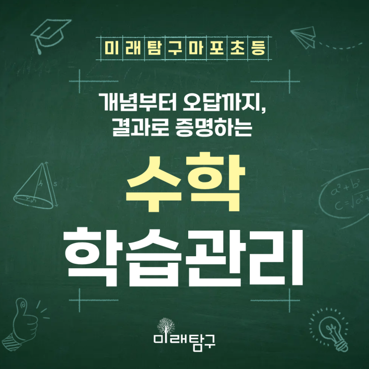 체계적인 학습관리, 결과로 증명합니다 수학 실력은 많이 푸는 것이 아니라 어떻게 정리하고, 어떻게 다시 점검하느냐에서 완성됩니다. 저희 미래탐구 마포 초등센터는 개념 → 풀이 → 오답 → 복습 → 점검 이 흐름이 끊기지 않도록 학습관리 시스템을 운영하고 있습니다. ▣ 개념노트 – 기초를 세우는 첫 단계 개념은 ‘알고 있다’가 아니라 설명할 수 있을 때 내 것이 됩니다. 수업 후에는 반드시 개념노트 작성을 통해 배운 내용을 스스로 정리하고 개념 간의 연결을 이해하며 이후 문제 풀이의 기반을 만듭니다. 개념 위에 유형을 쌓는 구조, 탄탄한 수학의 출발점입니다. ▣ 풀이노트 – 사고 과정의 완성 정답보다 중요한 것은 풀이 과....... <img src="https://blogthumb.pstatic.net/MjAyNjAyMDFfODgg/MDAxNzY5OTU1NTc4MTYz.-893coWDh2S_SuDNGghw5YHbjxutu_IljnaGx_mVR7kg.XECvbGzLrwzLb1dUUM7dnQpKiNf1d-7mefR1nHxvuSgg.PNG/%C1%A6%B8%F1%C0%BB_%C0%D4%B7%C2%C7%D8%C1%D6%BC%BC%BF%E4._%284%29.png?type=s3" />
