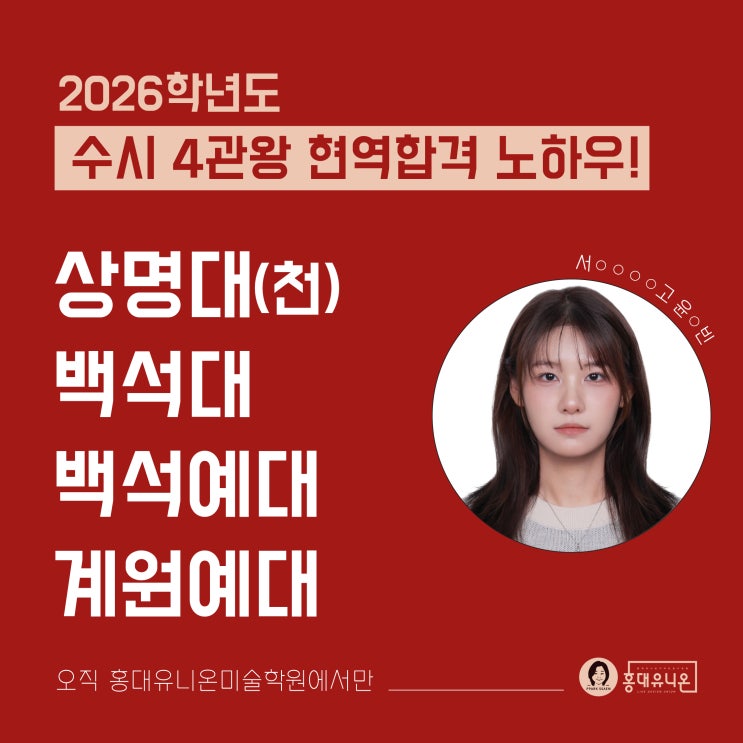 [2026 상명대천안/백석대/백석예대/계원예대] 수시 4관왕 합격! 예비반 출신 현역합격_홍대유니온미술학원_미대수시_미대정시