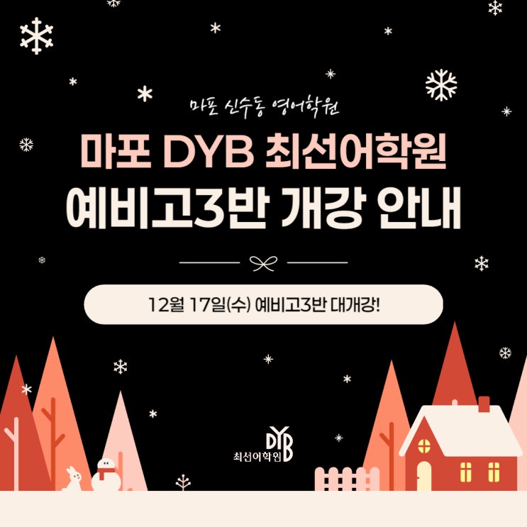 안녕하세요 DYB최선어학원 마포캠퍼스입니다. 마포 DYB 최선어학원 예비고3 대개강! 12월 17일(수)부터 마포 DYB 최선어학원에서 예비고3반(정시/수시 통합반)이 새롭게 시작됩니다. 예비고3 시기는 수능까지 남은 1년을 어떻게 준비하느냐에 따라 입시 전략이 크게 달라지는 중요한 때입니다. 마포 DYB 최선고등부의 예비고3 수업은 현재 실력을 정확히 점검하고, 정시·수시 모두를 대비할 수 있도록 탄탄한 커리큘럼으로 구성되어 있습니다. 본격적인 입시 대비를 시작하려는 학생들에게 이번 대개강은 확실한 첫걸음이 될 것입니다. 수능영어 절대평가의 배신 지난 주 2026학년도 수능 성적표가 배부되었습니다. 하지만 성적표를 받아....... <img src="https://blogthumb.pstatic.net/MjAyNTEyMTBfMTU1/MDAxNzY1MzM4OTU4MTUy.ENpMAvtRPF_aPQrXMUK67AENFvb1T5ECcLK31izzqMAg.q4PhXjn-oinPnoJ26y2noHlZZNR-XpzFtkPyT8TA7rMg.JPEG/%B8%B6%C6%F7_%BD%C5%BC%F6%B5%BF_%BF%B5%BE%EE%C7%D0%BF%F8_%282%29.jpg?type=s3" />