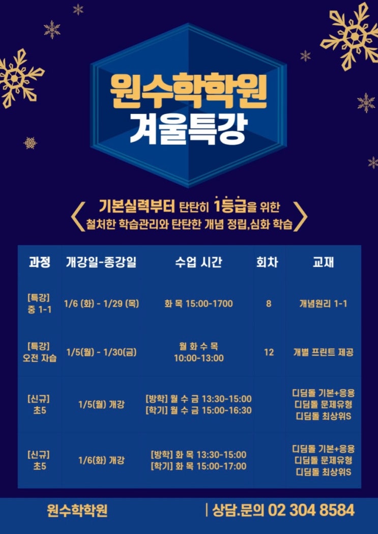 원수학 학원에서 1월부터 함께할 5학년 신규 반과 방학 특강 수업을 모집합니다. 신청은 02.304.8584로 전화 부탁드립니다. *다른 학년 기존 반도 상담 가능합니다* 2026년이 다가오고 있습니다. 이제 막 중학교와 고등학교에 올라갈 학생들에게 겨울방학은 가장 중요한 기회입니다. 중·고등학교는 ‘버티는 힘’이 필요한 곳입니다. 하지만 초등학교에서, 중학교에서 막 넘어온 학생들은 아직 그 힘이 충분히 길러지지 않은 경우가 많습니다. 그래서 겨울방학은 더욱 중요합니다. 매일 아침 책을 펴고, 오랜 시간 자리에 앉아 집중하는 힘을 기르고, 어려운 문제를 천천히 내 것으로 만들어가는 연습이 필요합니다. 처음에는 쉽지 않지만, 이 작....... <img src="https://blogthumb.pstatic.net/MjAyNTEyMTVfNzkg/MDAxNzY1ODA1NzMzOTE1.Je2yqskRwQ6sxU1wR__OCUiwUaStSGKRhM83KPju-acg.o0IPJF7axDtf3JLIlrOGVM6hVE9jDI8fxaEGr6dYDPAg.JPEG/IMG%A3%DF9050.jpg?type=s3" />