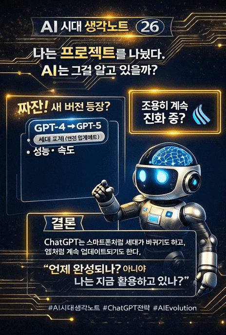 AI시대 생각노트 26 ChatGPT는 어떻게 업그레이드될까? ChatGPT를 2년간 사용하다 보니 이런 궁금증이 생겼습니다. 보통 핸드폰은 버젼이 업그레이드 되면 새폰으로 교체를 해야하고, 어플들도 데이트 업데이트과정이 있고, 게임들은 패치업을 해야하는데 챗지피티는 어느 순간 좌측 상단에 5.2로 바뀌는 걸 보고 궁금해서 챗지피티에게 질문을 해보았습니다. “버전이 바뀌면 완전히 새 제품처럼 교체되는 걸까?” “아니면 내가 쓰는 중에도 계속 조금씩 업데이트되는 걸까?” 스마트폰처럼 Samsung Galaxy S22 → S23 → S24 이렇게 ‘신제품 출시’ 개념일까요? 아니면 앱처럼 수시로 패치가 되는 구조일까요? 정답은 둘 다 입니다. 1️....... <img src="https://blogthumb.pstatic.net/MjAyNjAyMTZfMTA0/MDAxNzcxMjA4OTU4MDkz.KRrIXyvIcN8DSNrCnSFfwNABn9WiIzroXJ7M9ZLR49Mg.PrsgfthZHhZ_wR9wzz73SUVKPRDvIaLscbqoa5QJ--Ug.GIF/grok%A3%DFvideo%A3%DF2026%A3%AD02%A3%AD16%A3%AD11%A3%AD28%A3%AD17%A3%A81%A3%A9.gif?type=s3" />