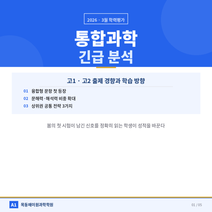 안녕하세요. 목동에이원과학학원 입니다. 지난 3월 24일, 새 학년 첫 번째 전국연합학력평가가 치러졌습니다. 많은 학생과 학부모님들이 결과를 받아보신 지금, 단순히 점수에 일희일비하기보다는 이번 3월 모의고사가 앞으로의 학습 방향에 어떤 신호를 주고 있는지를 읽어내는 것이 훨씬 중요합니다. 이번 평가는 2028 대입 개편 논의와 맞물려 통합과학의 위상이 어떻게 달라지고 있는지를 체감하게 해준 시험이기도 했습니다. 목동에이원과학학원의 방기화 선생님과 박진환 선생님이 다음카카오 입시 전문 채널 톺아보기에 출연해 과학 세션 분석 방송을 진행하셨으며, 그 내용을 바탕으로 지금 꼭 알아야 할 핵심만 정리해 드리겠습니다. 고....... <img src="https://blogthumb.pstatic.net/MjAyNjA0MDNfNzAg/MDAxNzc1MjA3NjY1OTQx.RMLhns6bre-iP0aX3sfjUorIW6IMbA8JINLStkVpefkg.bJR0cGz6JaYdkCbj6djQ8jAJuqbBPKdmTvsWu3Cs2TYg.PNG/%BF%A1%C0%CC%BF%F8%C4%AB%B5%E5%B4%BA%BD%BA_01_%C7%A5%C1%F6.png?type=s3" />