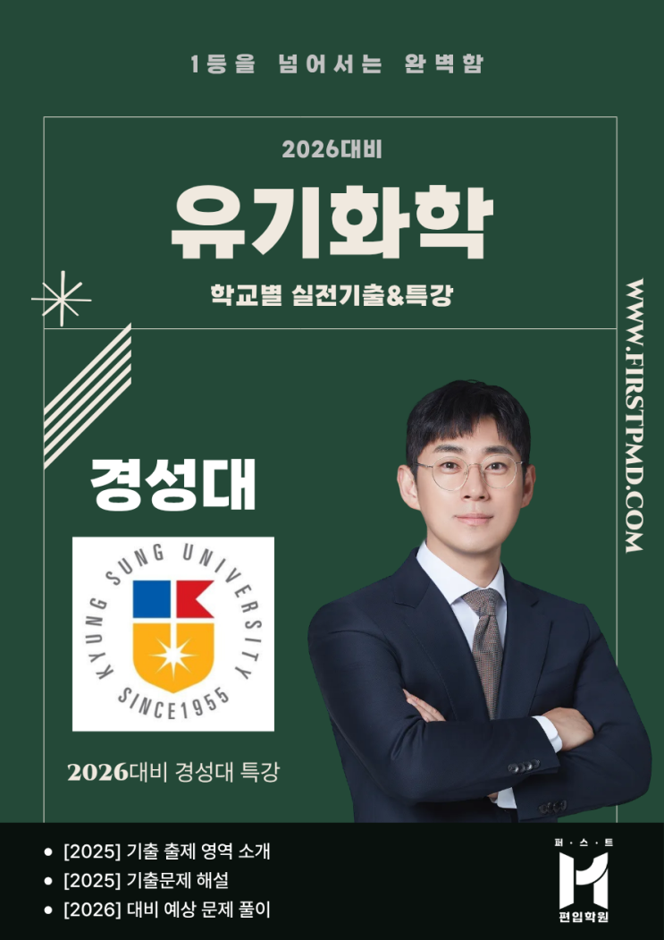 안녕하세요 퍼스트 편입학원입니다. 2026대비 경성대학교 유기화학 실전기출&예상문제 특강이 오픈했습니다. 경성대 화학 총 20문제 출제, 11문제 유기화학 경성대 총 40문제, 45분 시험 ★ 일반화학 개념 및 간단 계산형 문제 일반생물학 간단 개념 문제 유기화학 난이도가 가장 높아 유기를 누가 더 1문제라도 맞히느냐가 가장 중요 ★ ● 합격의 기준을 바꾸는 유기화학 ” 경성대 ” 특강 – 명명법 – 입체화학 개념 – 작용기 변환[방향족 화합물] – 작용기 변환 [알켄의 제법] – 작용기 변환 [에폭사이드 고리열림] – 친핵성 치환, 에스터 가수분해 – 작용기 변환 [아세탈 합성, 카보닐 알파치환] – IR 스펙트럼 – Proton NMR p....... <img src="https://blogthumb.pstatic.net/MjAyNTEyMTlfNTgg/MDAxNzY2MTExOTQwNTQx.Mmpydbuz2r-XP3w83SxtxuJTfI2IKmy9Ioy6u8MKsI8g.Ghtc-3h312Hn-eIjzqfdwZGk8BvpMV9C2a7EVC4rWoAg.PNG/%C0%AF%B1%E2%C8%AD%C7%D0_%C6%AF%B0%AD_%281%29.png?type=s3" />