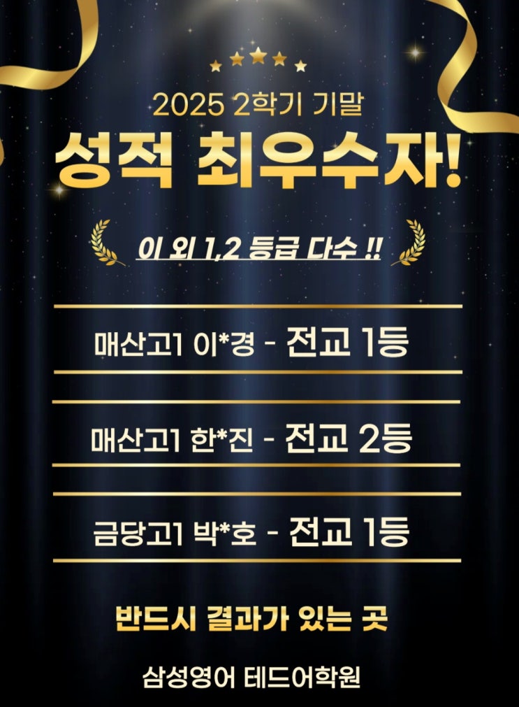 전교 1등은 누가 하는 건가요? 간혹, 학부모님들이 말씀하십니다. "에이~ 그 아이는 원래 잘하잖아요." 그렇다면, 정말 특별한 학습력을 가진 아이들만 전교 1등을 할 수 있을까요? 적어도 테드어학원에서는 50%는 틀린 말입니다. 저희 학원 상위권/최상위권 학생중에는 우리 학원에 처음 왔을 때 성적은 중간 이하에 자신감은 바닥이었던 학생들이 상당 수 였다는게 겁니다. 그렇다면 어떻게 그게 가능했고 지금도 가능할까요? 오늘은 그 이유를 딱! 3가지로 정리해드리겠습니다. 1. 개인별 맞춤 수업 요즘은 말 그대로 핵개인 다양 맞춤화 시대입니다. 개인별 맞춤 수업이라는 수업 형태가 낯설었던 10여년 전부터 누구나 의....... <img src="https://blogthumb.pstatic.net/MjAyNTEyMjFfMjg3/MDAxNzY2MzExMDE2NzA2.PxeWE_8_Tmhjj-da62KPa8pIEwrHExZvvsBvf3tutsEg.LfcQ98S5Ax1rEyKsA4ZU4WkJfaezAfgLIffYm6cslBAg.JPEG/%C3%D6%BF%EC%BC%F6%C0%DA.jpg?type=s3" />