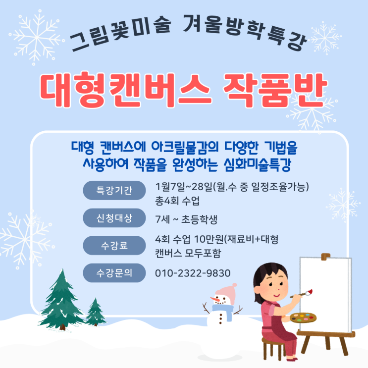 그림꽃미술 겨울방학 특강 ❄️ 대형 캔버스 작품반 모집합니다! 안녕하세요, 그림꽃미술입니다 다가오는 겨울방학을 맞아 아이들이 스스로 한 작품을 완성하는 경험을 할 수 있는 특별한 프로그램을 준비했어요. 평소에 쉽게 도전하기 어려운 대형 캔버스 작업을 통해 아이들이 집중력·성취감·창의성을 깊이 느낄 수 있도록 구성된 수업입니다. “아이의 겨울방학, 작품이 되는 순간을 선물하세요.” ✨ --- 대형 캔버스 작품반이란? 아이들은 수업마다 단계별 과정을 거쳐 나만의 대형 작품 1점을 완성하게 됩니다. 작품 하나가 완성되기까지의 과정 자체가 아이의 성장을 이끌어주고, 완성된 결과물은 집 어디에 걸어도 정말 예....... <img src="https://blogthumb.pstatic.net/MjAyNTEyMTBfMTEw/MDAxNzY1MzcxMjMzMDEx.WWkRY0oTN_1P4gdfOK4dI1pgkhqYGWrHhC_B8KwaY3Mg.WPBaAO-7aAgZldqPJyNloXivJ7wjnPGCk4gUFi19c84g.PNG/%C6%C4%B6%F5%BB%F6_%C8%F2%BB%F6_%C0%CF%B7%AF%BD%BA%C6%AE_%B0%DC%BF%EF_%B9%E6%C7%D0_%C7%D0%BF%F8_%C6%AF%B0%AD_%B8%F0%C1%FD_%C0%CE%BD%BA%C5%B8%B1%D7%B7%A5_%C6%F7%BD%BA%C6%AE.png?type=s3" />