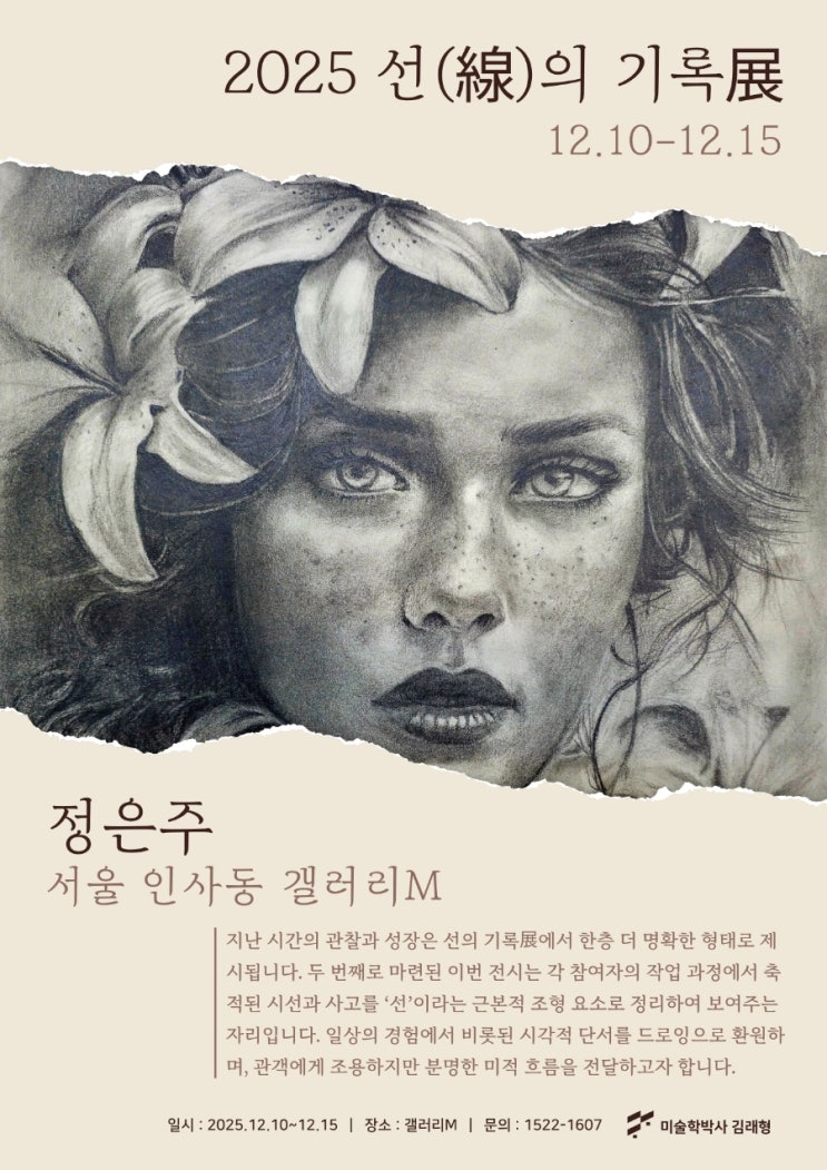 갤러리 엠 드로잉전 초대 제가 지도하는 제자들의 드로잉 작업을 갤러리 엠에서 한자리에 모아 선보입니다. 각자가 바라본 세계를 선으로 기록해낸 이번 전시는 관찰과 해석, 집중의 시간이 고스란히 담긴 결과물입니다. 붓끝과 연필 끝에서 태어난 사유의 흐름이 여러분께 조용한 울림으로 전해지길 바랍니다. 학생들의 진지한 열정과 성장의 발자취를 따뜻한 시선으로 함께 응원해 주세요. 장소: 갤러리 엠 전시 기간: 2025.12.10~ 지도: 래미술학원 #드로잉전 #학생전시 #연필화 #래미술학원 #대치동미술학원 교육적 참고 기반의 연습작이며, 원작자 미확인·저작권은 원작자에게 있음 <img src="https://blogthumb.pstatic.net/MjAyNTEyMTZfMTcx/MDAxNzY1ODc2ODg2Nzc4.lcCmjQwb5Nb08OHP0z_KRiUWAGN613XyNqw5Iifljfkg.0udO0Iu-Irp_WC8yp1ed_5CSB9S4chdlMEMbmDNUd2Ug.JPEG/900%A3%DF1764588232179.jpg?type=s3" />