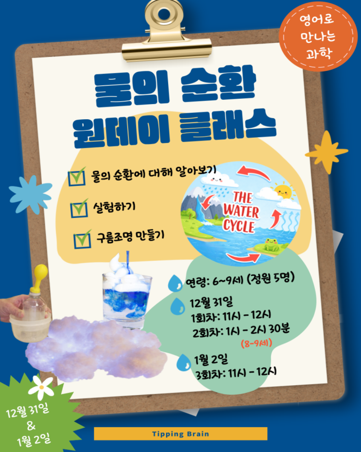 수업 문의 및 상담은 카카오톡 채널을 이용해주시기 바랍니다. 카카오톡 채널 특별체험수업 물의 순환 (Water Cycle) 티핑브레인 영어과학 원데이 클래스 이번 겨울방학 어떤 계획을 하고 계신가요? 티핑브레인에서 함께하는 영어과학 원데이 클래스! 비는 왜 내리는 걸까? 물은 어디서 부터 시작된걸까? 재밌는 과학실험에 영어까지 더해져 아이들의 호기심도 upup! (공통) 주요 단어 -Water -Cloud -Rain -Sun -Up -Down (8-9세) 주요 단어 -Water Cycle (물이 도는 과정) *아이들이 사용하지 않고 실험하는 과정에서 단어에 노출되는 경험 가지기* -Evaporation (물이 위로 올라감) -Condensation (구름이 만들....... <img src="https://blogthumb.pstatic.net/MjAyNTEyMjJfNDgg/MDAxNzY2MzgwMjA3MDUx.x2YQhRqCVFMe0Lq6vb0aYcNWcnPHGcluSQuRniDjGCcg.2P0HLj8-0OpgkO3O4RINFBuwfw-T8ecRrZa0fcx8hzUg.PNG/%C0%CE%BD%BA%C5%B8%BF%EB-%C1%A4%B1%D4-%BF%F8%B5%A5%C0%CC-%BC%BC%B7%CE-001_%283%29.png?type=s3" />