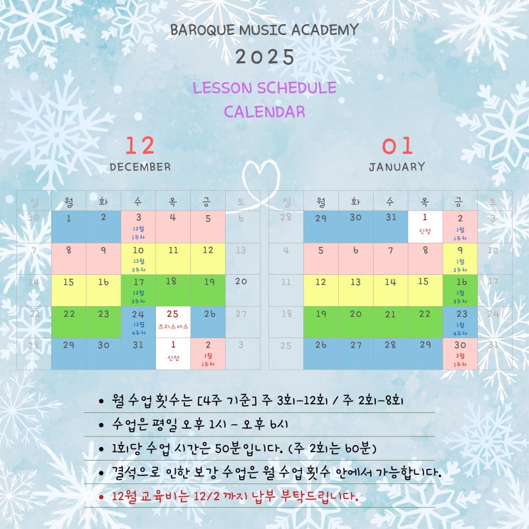 안녕하세요. 피아노 앞에서 당당한 바로크음악교습소입니다. 올 한 해 수업에 꾸준히 참여한 모든 학생들과 학부모님께 진심으로 감사드립니다. 어느덧 한 해의 끝자락, 2025년 마지막 달 12월이 찾아왔습니다. 이번 달에도 즐거운 배움과 성장을 이어갈 수 있도록 등원 부탁드립니다. #바로크음악교습소 2025년 12월 - 2026년 1월 수업 스케줄 #휴강공지 12월 25일 과 1월 1일 크리스마스와 신정 (공휴일)은 휴강입니다. 잉여 수업일에 포함되는 휴강으로 보강이 없습니다. 단, 12월 수업일 수가 모자른 학생은 보강이 가능한 날 미리 연락주시고 등원 부탁드립니다. 2025년 12월도 의미 있고 따뜻한 시간으로 채워지시길 바랍니다. 2026년에도....... <img src="https://blogthumb.pstatic.net/MjAyNTExMjlfMzMg/MDAxNzY0NDEyMzUzOTgy.-WAH8RB6JmtYviVtSceYvHaaMRb4Bb72bu6C8wUyGnog.0w7GTOrmpkXhVfTReG88FXHyMf1-VOeaXZdClrtgfgAg.JPEG/12_1%BF%F9.jpg?type=s3" />