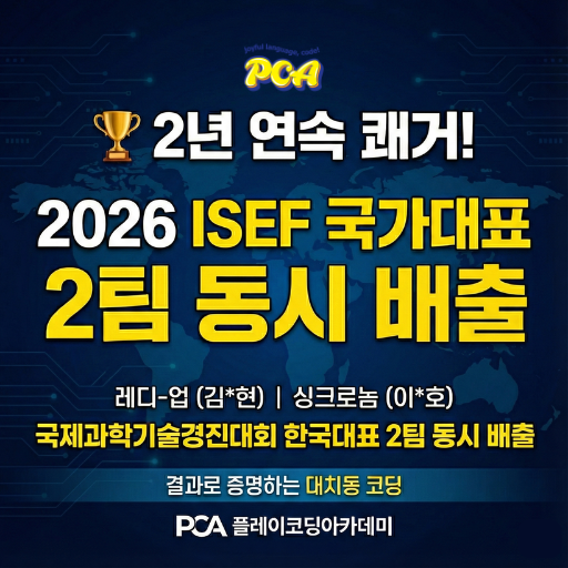 안녕하세요, 언제나 결과로 증명하는 대치동 코딩 입시의 중심, 플레이코딩아카데미입니다. 2025 ISEF 국가대표 배출에 이어, 2026 ISEF 국가대표 2팀(2명) 동시 선발! 대치동 코딩 입시의 압도적 중심! 오늘은 PCA의 교육 역사에 남을 가슴 벅찬 소식을 전해드립니다. 전 세계 청소년 과학 영재들의 꿈의 무대, 2026년 국제과학기술경진대회(ISEF) 한국 대표 선발전에서 플레이코딩아카데미 원생 2팀(2명)이 동시에 국가대표로 선발되었습니다. 작년(2025 ISEF) 국가대표 배출에 이어, 올해는 원생중 무려 두 팀이 태극마크를 달게 되었습니다. 이로써 PCA는 '2년 연속 ISEF 국가대표 배출'이라는 압도적인 입시/대회 성과를 증명해냈....... <img src="https://blogthumb.pstatic.net/MjAyNTEyMTFfNzEg/MDAxNzY1NDQzNDYzMjI1.-VMEcdfFEllqp_0VG3vynKi4A7UebRAJTYxU_rd2O6Eg.4R61JfsyzcHKK0ZCQgAwsHj75_tlzEQR77bouGqawZMg.PNG/2026_ISEF_%B1%B9%B0%A1%B4%EB%C7%A5_%BC%B1%B9%DF_%BD%E6%B3%D7%C0%CF_%282%29.png?type=s3" />