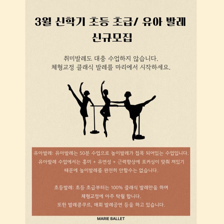 경산 교육 지원청 제 1144호 26년 신학기 신규인원 모집!! 마리발레에서 이쁘체형을 함께 만들 친구들을 모집합니다. ^^ 체형맛집 마리발레에서 체형도 교정하고 제대로된 발레를 경험 시켜주세요. 모든 강사진 , 원장T는 발레전공자들로 수업관련 다양한 자격증도 보유하고 있습니다. *유아발레 주2회 4주기준 총 8회 10만원 회당 [50분 수업] *초등발레 주2회 4주기준 총 8회 12만원 회당[60분 수업] 육아중 이거나 수업중에는 전화 연결이 어렵 습니다. 문의사항은 문자 남겨주시면 확인하는대로 답변드리고 있습니다. 아니면 통화 가능시간을 남겨주시면 콜백 드리겠습니다. <img src="https://blogthumb.pstatic.net/MjAyNjAyMTFfMjUw/MDAxNzcwODAzNTg1MDgy.vM_qCJgRUHG0NZPfOycbHa9FqLv4OLJOc8kvCMZMhikg.3byOGKZ-MvkxihQLLd72eS_v_5wFC-HOAt22Z9QuNJEg.JPEG/%C1%A6%B8%F1%C0%BB_%C0%D4%B7%C2%C7%D8%C1%D6%BC%BC%BF%E4._%282%29.jpg?type=s3" />