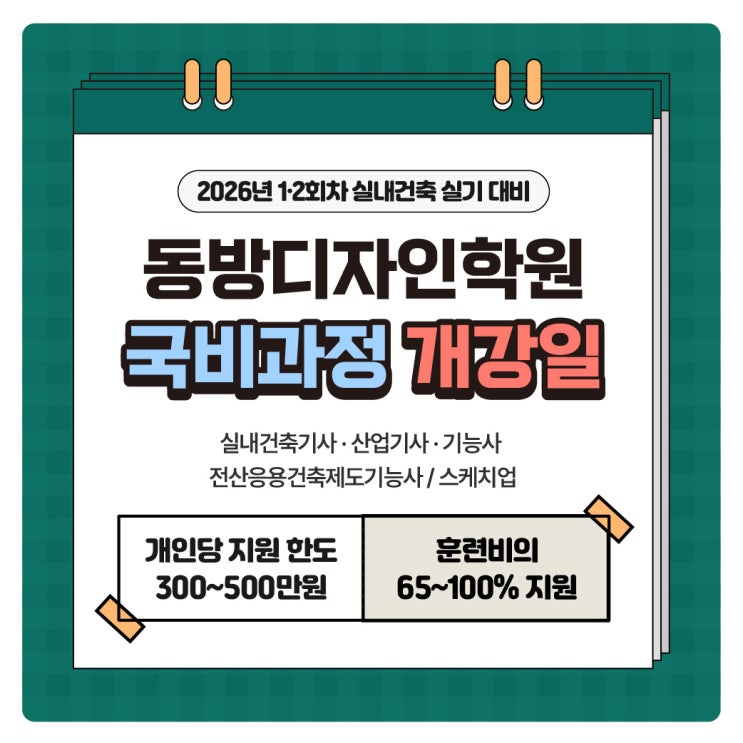 2026년 1·2회차 실내건축 및 전산응용 국비 과정 개강 일정 안내_종일반, 주말반 (3~5월)