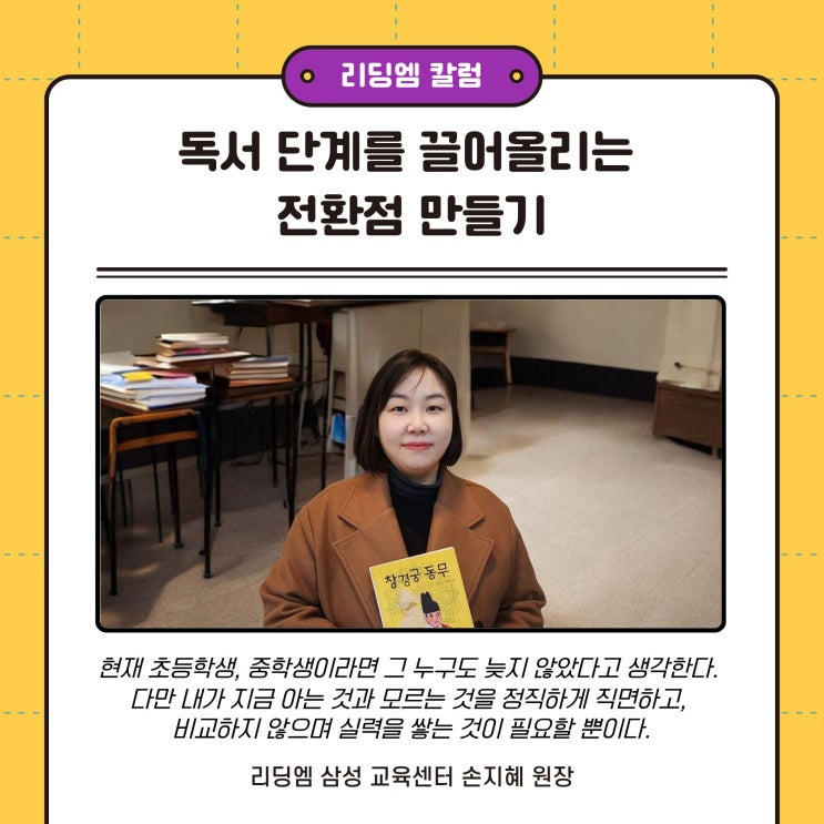 책이 어려워요, 너무 길어요 비문학 도서로 넘어가는 순간 아이들이 가장 많이 하는 이야기죠. 오늘은 이 순간을 "독서 단계의 전환점"으로 보고, 초등은 어휘의 디딤돌, 중등은 노력의 루틴으로 자연스럽게 넘어가는 방법을 알려드립니다. 독서 단계를 끌어올리는 전환점 만들기 40쪽 내외의 양장본 책을 읽던 2학년 학생들이 80~100쪽 분량의 비문학 도서로 넘어갈 무렵이면 어김없이 '어렵다'는 문의가 들어온다. 책이 익숙지 않은 4-5학년 학생들에게도 250쪽 넘는 도서가 주어지면 '너무 길다'는 목소리가 곳곳에서 들린다. 소설은 곧잘 읽던 중고등학생의 경우에도 깊이 있는 사회학/과학/인문학 도서로 넘....... <img src="https://blogthumb.pstatic.net/MjAyNjAyMTFfMjc4/MDAxNzcwNzY3MjQ2ODE3.i6aCUUq0C4A_OvDHWLgbb0tnO-YRpnz7LsvsRqMdQncg.EZxgQ4gt-TNPYpd4glt7QleWB5LJrEc9pdRDld3rFlUg.JPEG/1.jpg?type=s3" />