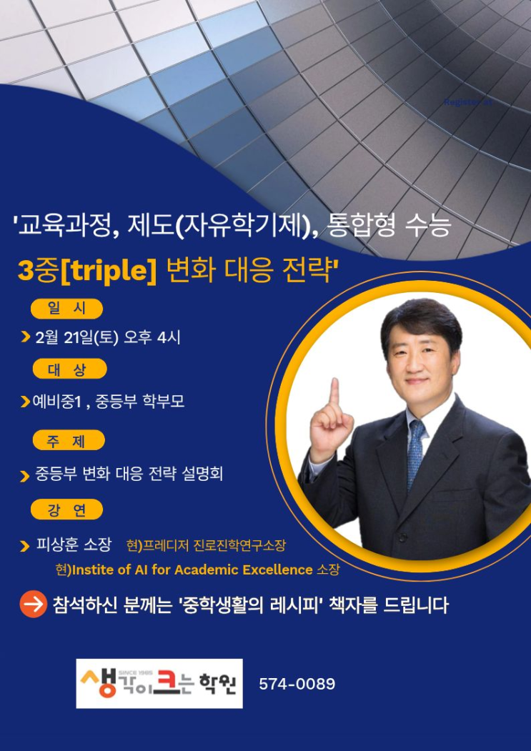 안녕하세요 강남 개포동에 위치한 생각이크는학원입니다. 이번 2월 21일(토), 중등부 학부모님들을 위한 중요한 일정이 함께 진행됩니다. ① 교육과정·자유학기제·통합형 수능 3중 변화 대응 전략 설명회 ② 조슈아영어 강남개포점 OPEN 이벤트 같은 날 진행되는 만큼 자녀의 학습 방향과 영어 전략까지 한 번에 점검하실 수 있는 기회입니다. ────────────────── ■ 중등 변화 대응 전략 설명회 주제 교육과정·제도(자유학기제)·통합형 수능 3중(triple) 변화 대응 전략 일시 2월 21일(토) 오후 4시 대상 예비중1 및 중등부 학부모 강연 피상훈 소장 현 프레디저 진로진학연구소 소장 현....... <img src="https://blogthumb.pstatic.net/MjAyNjAyMTJfMjU0/MDAxNzcwODc5MjExOTY2.oIZ1TWDG-bsmq8qSmJVlhrGw4Ymu0aWBzp3UiiAr1nMg.Q9CDVz-1eWJTPfIkc_-J70JY_6mb6Mjs370YNef6P2Ug.PNG/image.png?type=s3" />